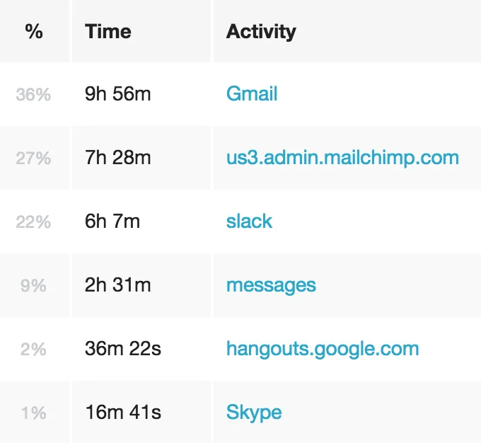Of that time, 53% was spent on 'Communication'. Here are my top categories: